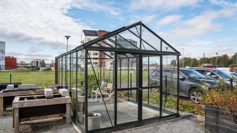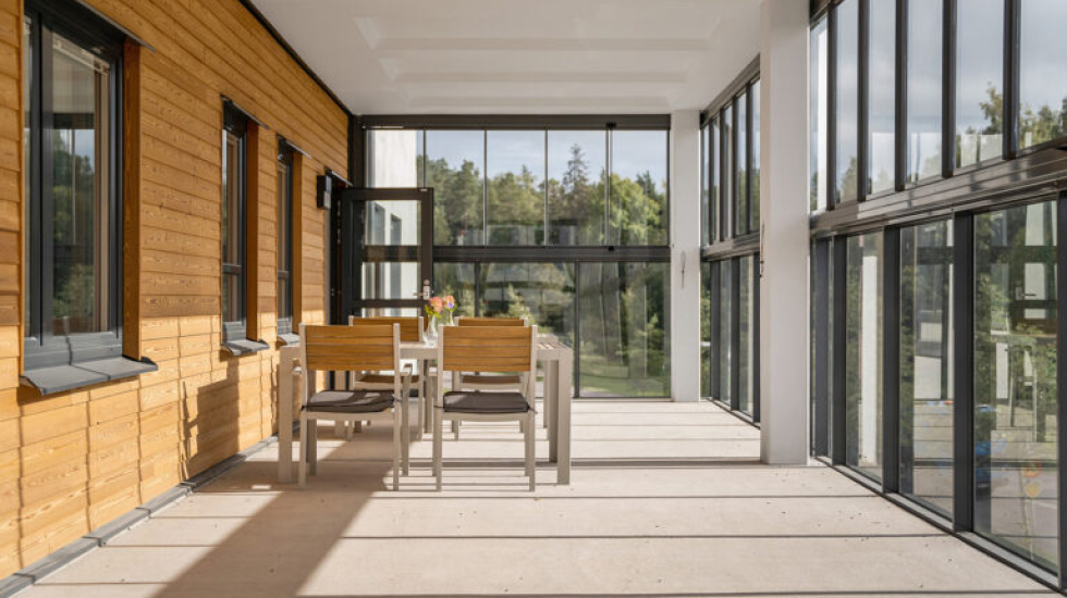 Stora inglasade balkonger nås enkelt från varje avdelning. På baksidan breder en mysig innergård ut sig, med promenadvägar, sittgrupper, vackra växter och en damm, vattenkonst, hammock, pergola, växthus och fruktlund.