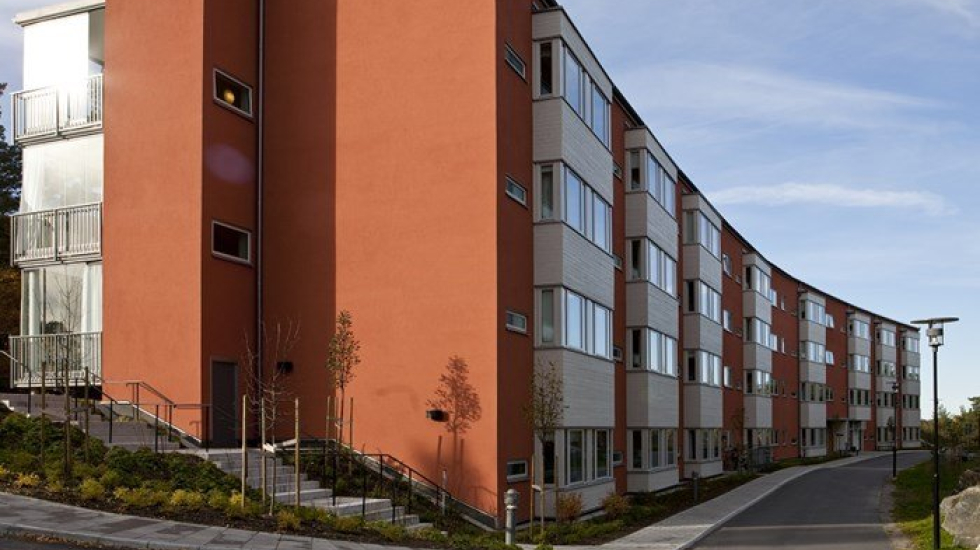 Det finns gemensamt allrum och matsal med en stor inglasad balkong i anslutning.