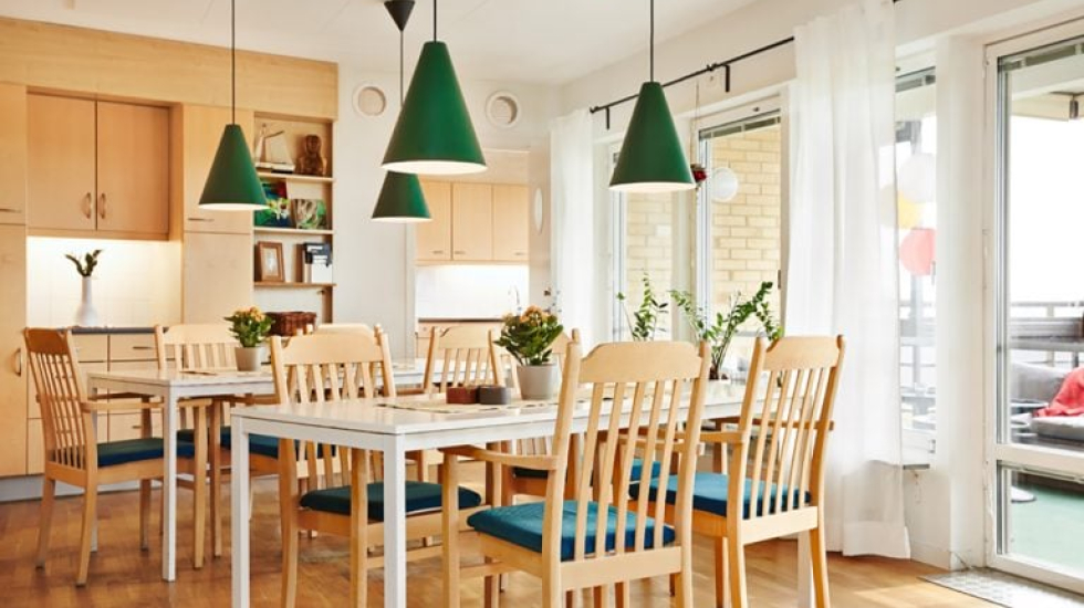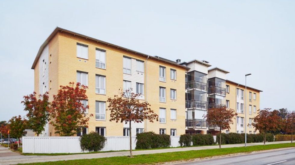 Avdelningarna har öppen planlösning med umgängesdel och matsal. På bottenplan finns en stor uteplats och på övriga våningar en möblerad balkong i söderläge direkt i anslutning till allrummet.
