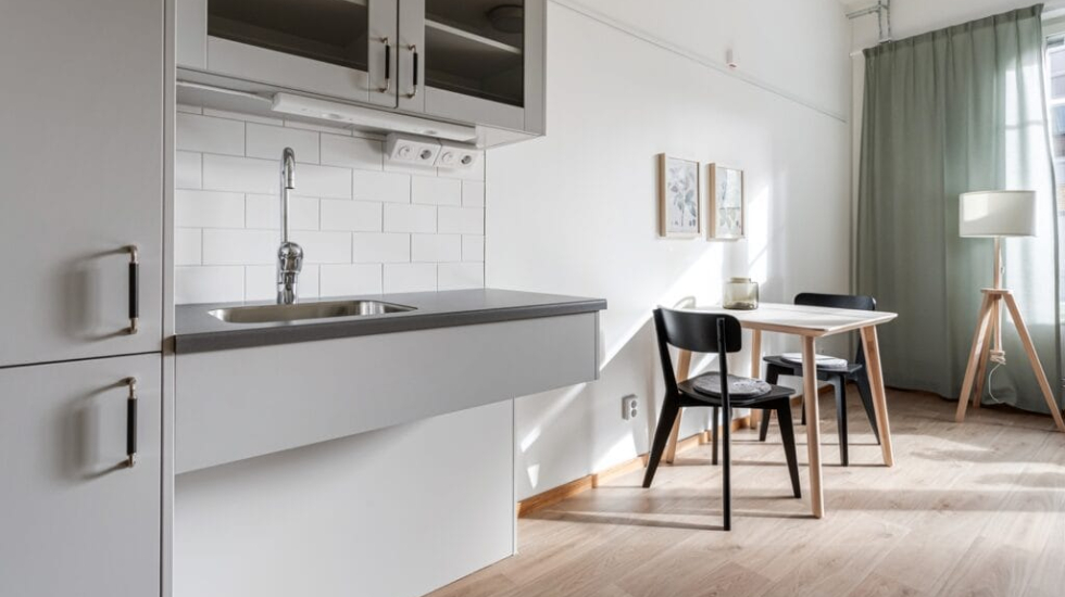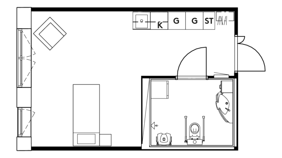 Din egen lägenhet är ca 30 kvadratmeter och utrustad med trinettkök med kylskåp, garderob. Badrummet är handikappanpassat med dusch. Trygghetslarm och rörelselarm finns. Lägenheten har en höj- och sänkbar säng, i övrigt möblerar du med dina egna möbler och saker.