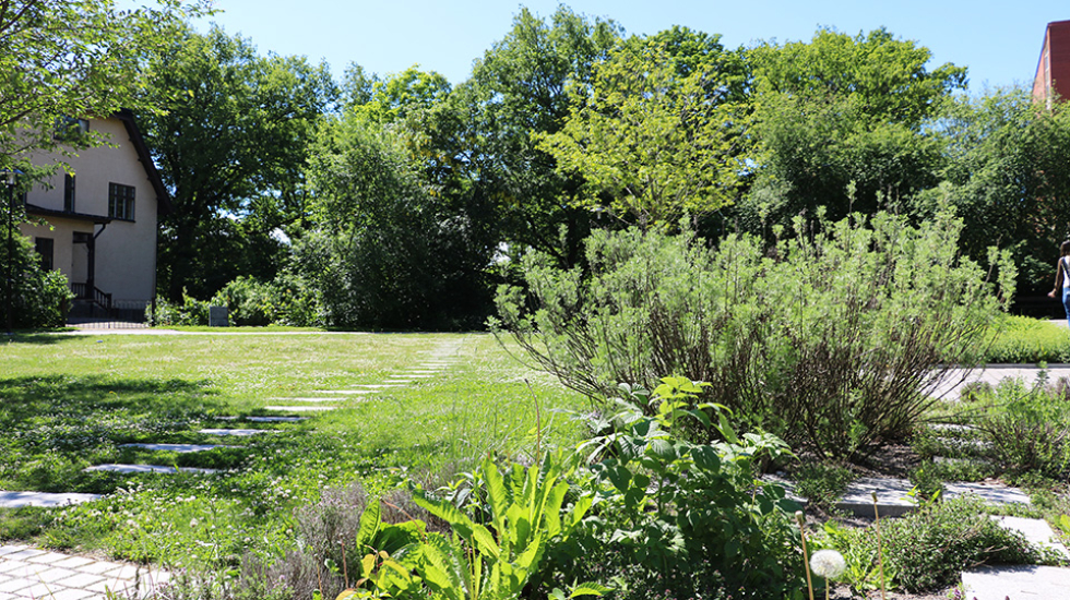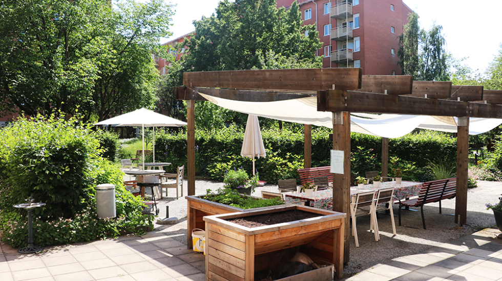Vi har tillgång till en stor innergård där man bland annat kan promenera och spela boule. Sommartid anordnar vi förutom aktiviteter även café i trädgården.