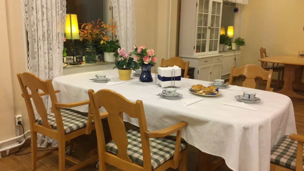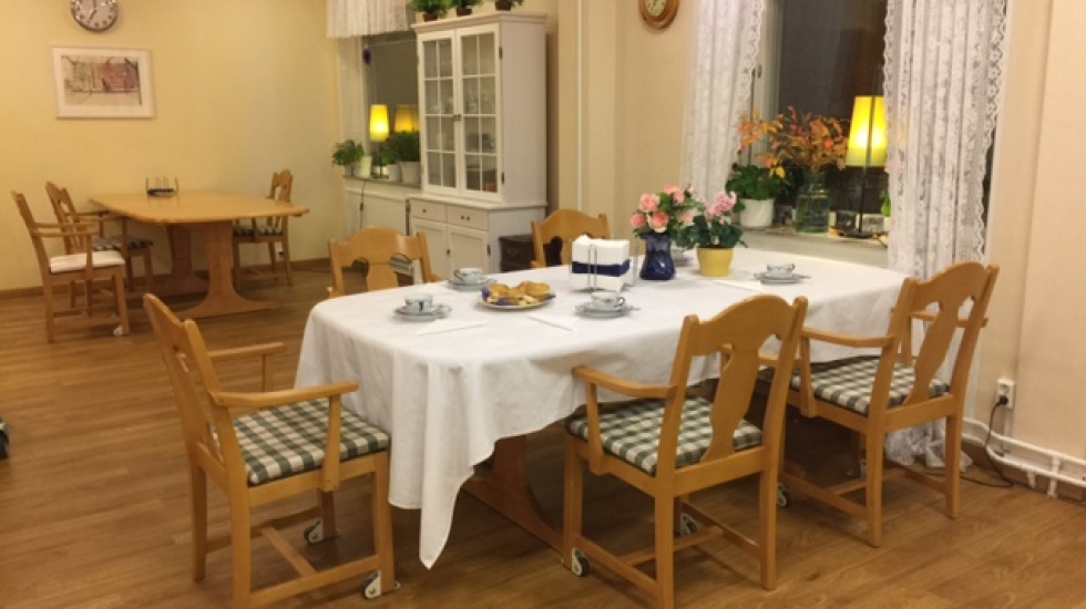 Måltiderna är en trevlig stund på dagen, då vi försöker skapa en harmonisk miljö och maten serveras på ett aptitligt vis. Personalen sitter med under måltiderna som stöd för de som behöver hjälp. På våra demensavdelningar är vi noga med att duka med porslin som skapar kontraster gentemot maten så den är lättare att se. Vi äter tillsammans i avdelningarnas matsalar eller så kan man välja att äta i sin egna lägenhet.