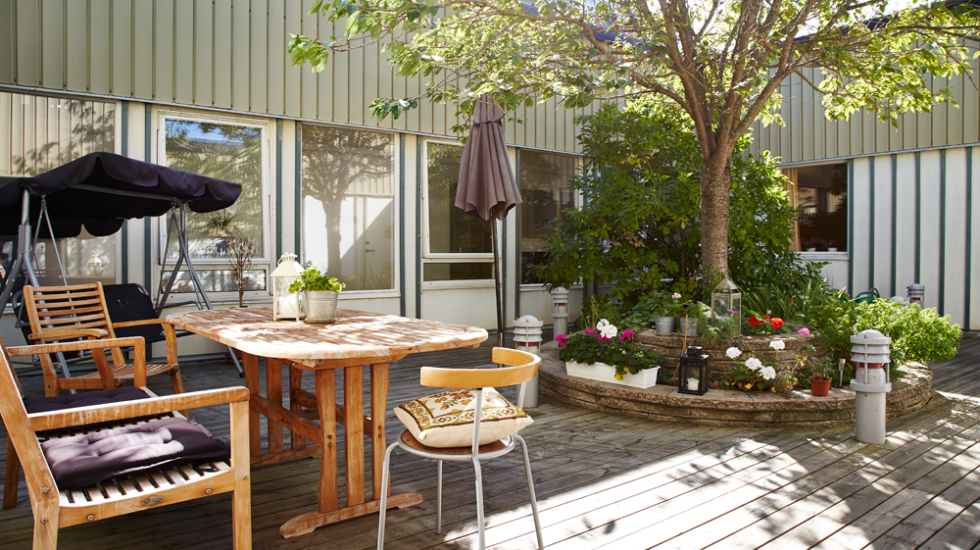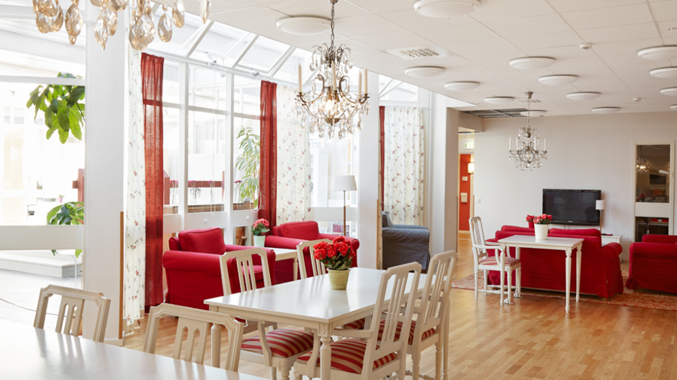 Varje avdelning har ett gemensamt kök och trivsamma utrymmen för samvaro och måltider. Det finns gemensamma uteplatser samt en vinterträdgård som vi nyttjar till alla möjliga händelser och event.