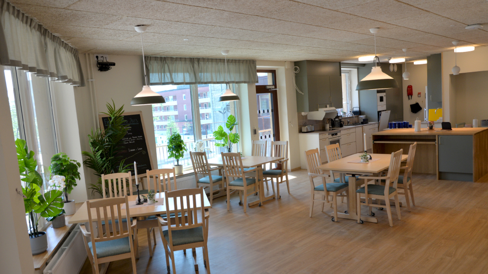 Varje våningsplan har ljusa gemensamma utrymmen med kök, matrum och vardagsrum. De rymliga inglasade balkongerna på varje våning kan användas året om. Färgsättning och möblering är valda för att skapa en trevlig lugn och ljus atmosfär.