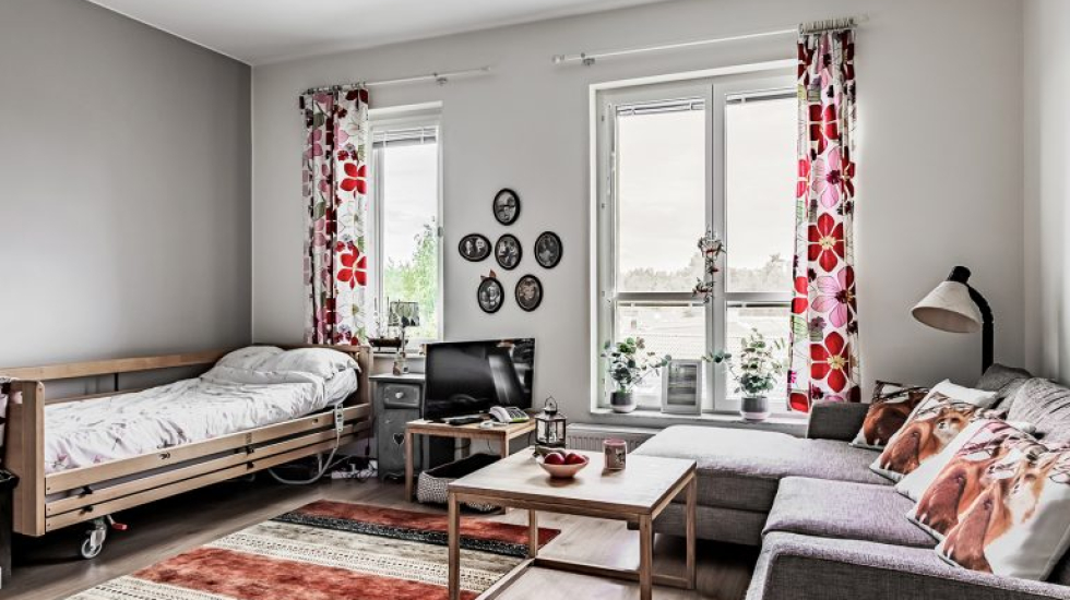 Din egen lägenhet är ca 30 kvadratmeter och utrustad med trinettkök med kylskåp samt garderob. Badrummet är handikappanpassat med dusch. Trygghetslarm och rörelselarm finns. Lägenheten har en höj- och sänkbar säng, i övrigt möblerar du med dina egna möbler och saker.