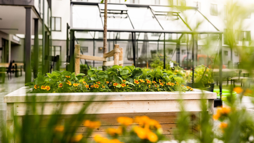 Vi är mycket stolta över vår trädgård. Här finns blommor, fruktträd och bärbuskar. Du som gillar odling kommer kunna hjälpa till att så och skörda grönsaker och blommor i våra odlingslådor. I trädgården finns också ett rymligt växthus. Här kan man sitta och bara njuta eller pyssla med växterna.