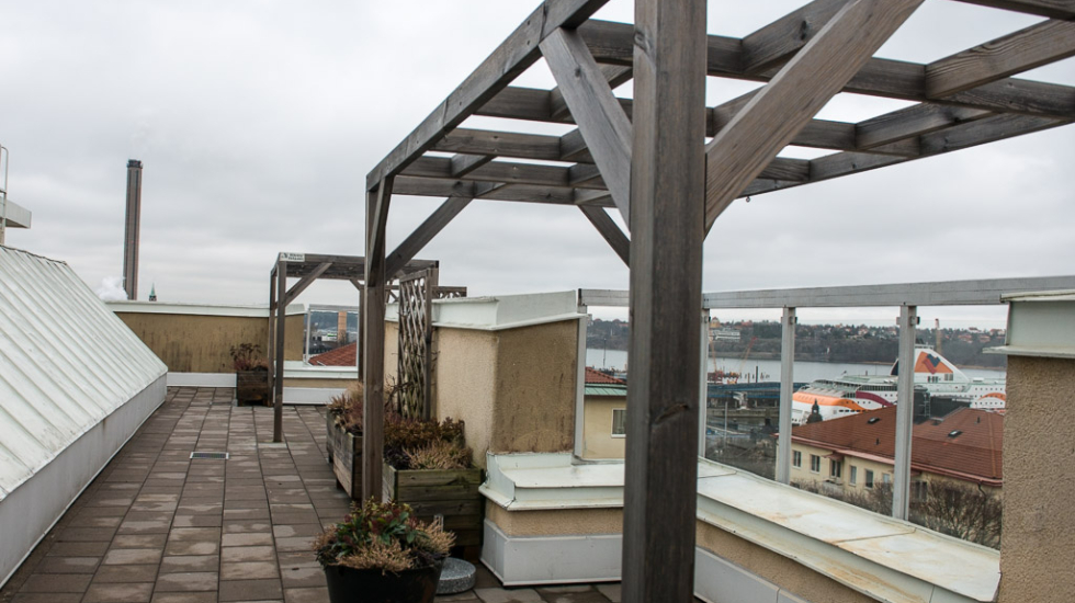 De tre översta våningarna på Sandhamnsgatan 6 rymmer ett seniorboende för HBTQ-personer. Dessa lägenheter förmedlas av kooperativet Regnbågen.