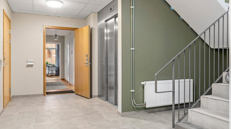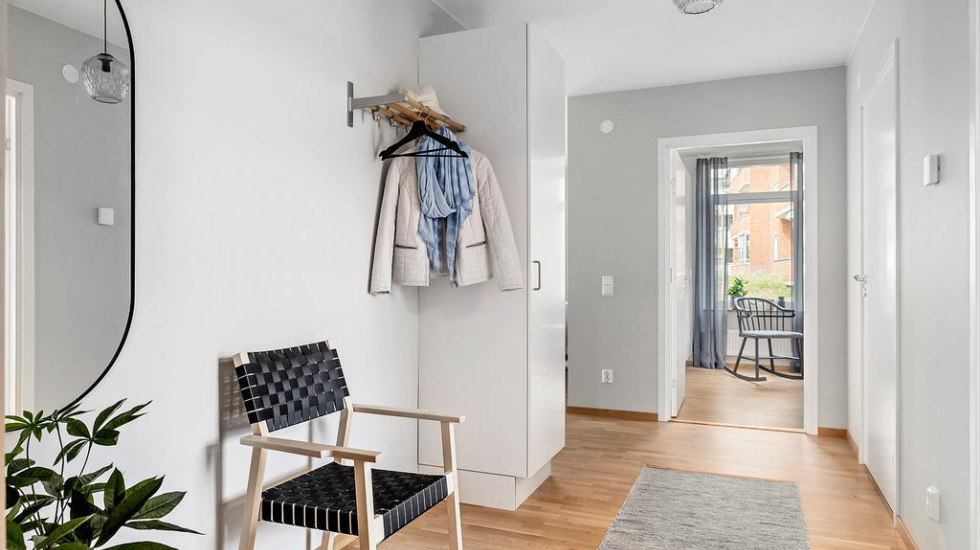Innanför din entrédörr, som har tittöga och ringklocka, finns en hall med garderob och hatthylla. På golvet ligger ekparkett som fortsätter in genom hela lägenheten. Väggarna är målade i en ljust varmgrå kulör.