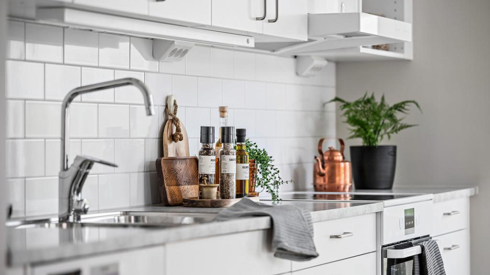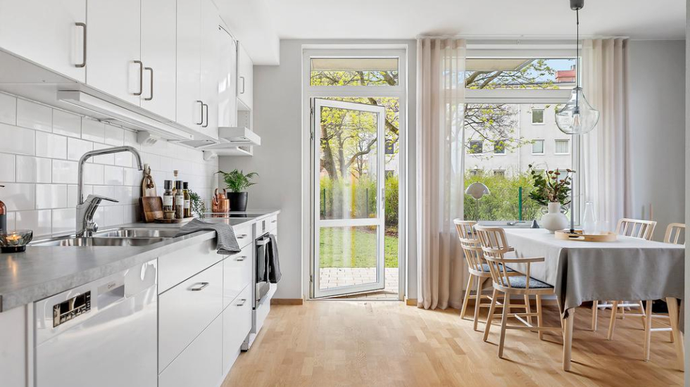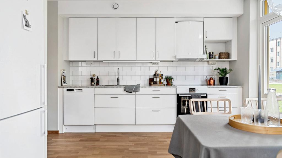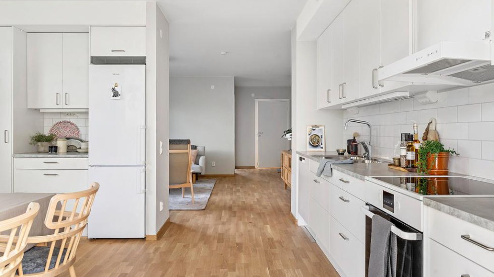 Köket har vita tidlösa luckor med greppvänliga bygelhandtag. Köket är utrustat med diskmaskin, spis med glaskeramikhäll och ugn samt kyl/frysskåp.