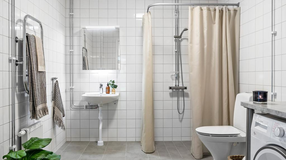 Badrummen har grå klinkerplattor på golvet och vita kakelplattor på väggarna. Din handduk torkar snabbt på den elektriska handdukstorken och i duschen finns ett handtag monterat på väggen. I alla lägenheter finns dessutom en kombinerad tvättmaskin och torktumlare.